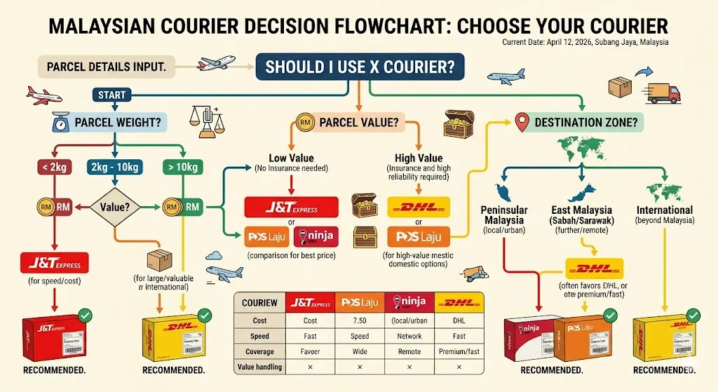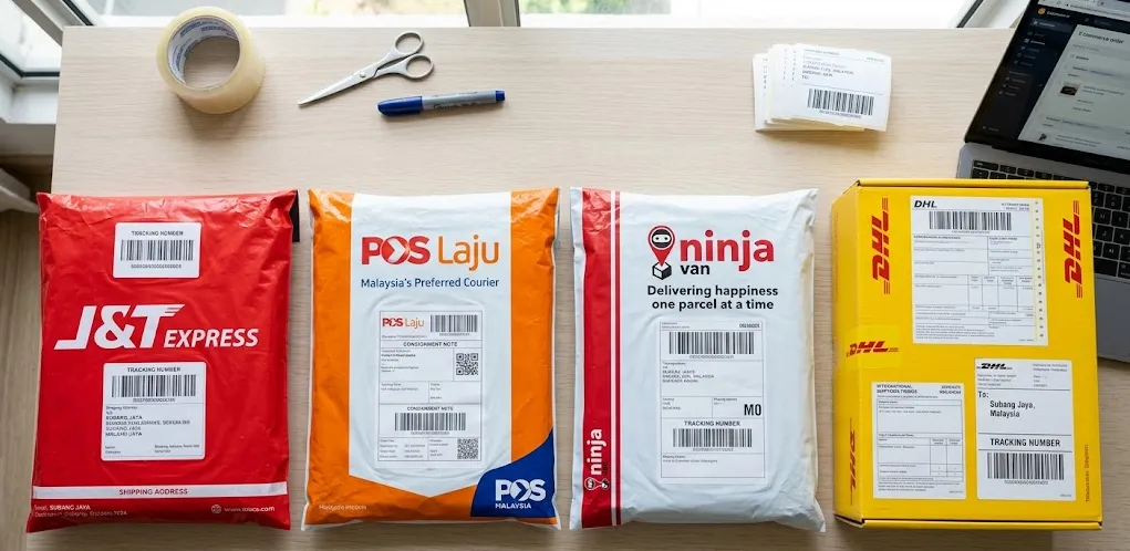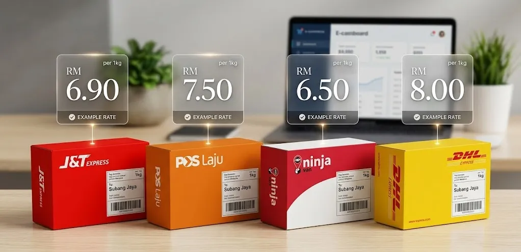 Untuk parcel bawah 1kg di Semenanjung, J&T (dari RM5.42) dan Flash Express (dari RM5.27 melalui EasyParcel) adalah paling jimat. Pos Laju (RM6.50) dan Ninja Van (RM6.00) lagi stabil tapi sedikit mahal. DHL eCommerce (dari RM15) lebih sesuai untuk parcel bernilai tinggi atau hantaran antarabangsa, bukan jualan harian.