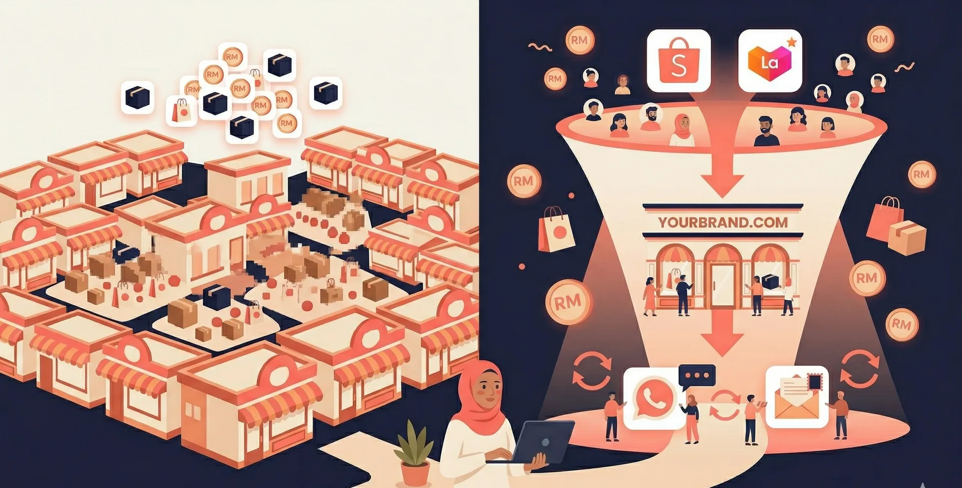 Ramai peniaga Malaysia mula jual online di Shopee atau Lazada sebab senang. Memang betul, marketplace dah sediakan traffic dan sistem pembayaran. Tapi lepas beberapa bulan, ramai yang sedar: commission makin naik, customer tak kenal brand anda, dan anda tak ada data pelanggan sendiri. Jadi, patut ke anda kekal di marketplace, pindah ke website sendiri, atau guna dua-dua?